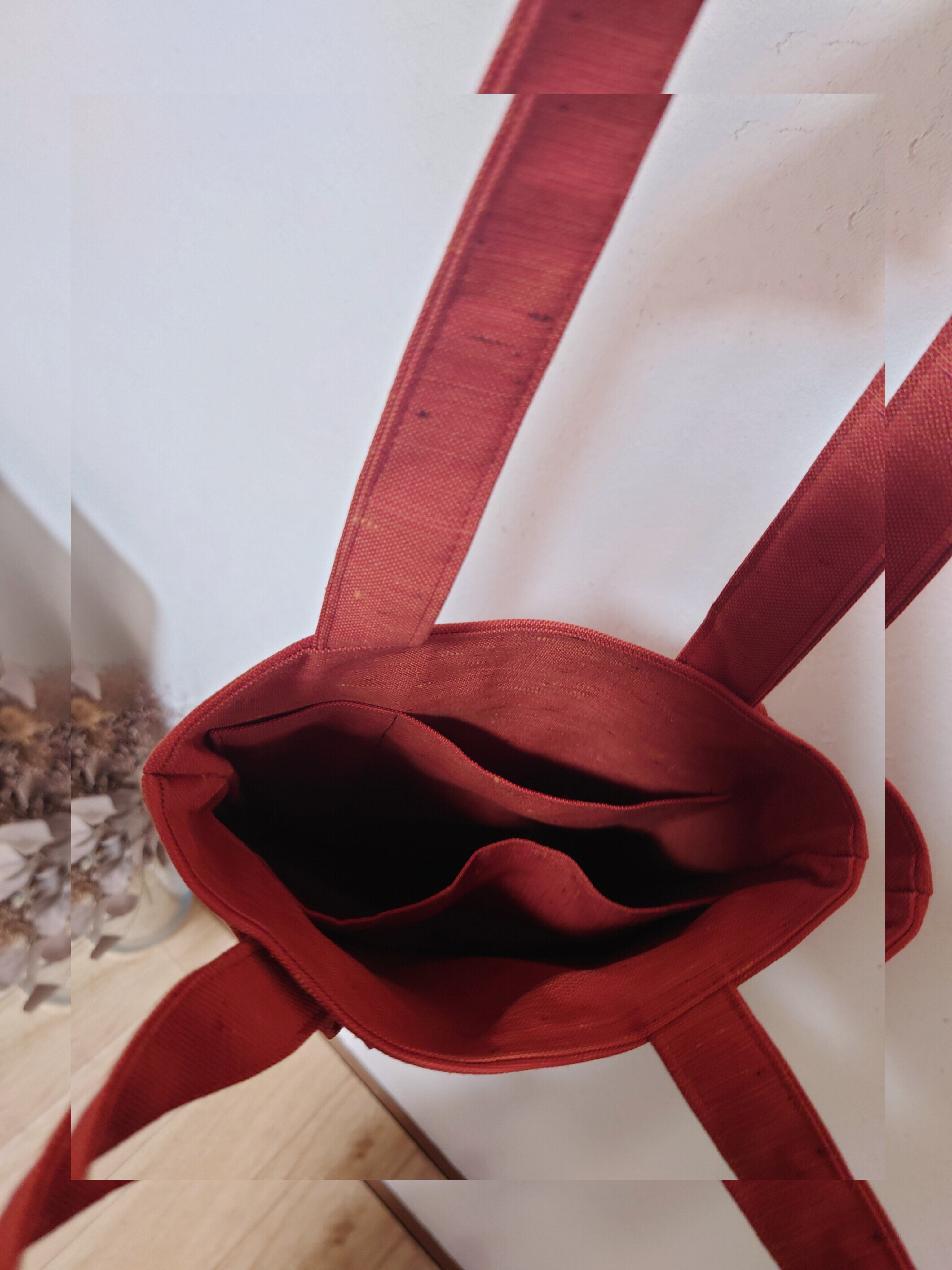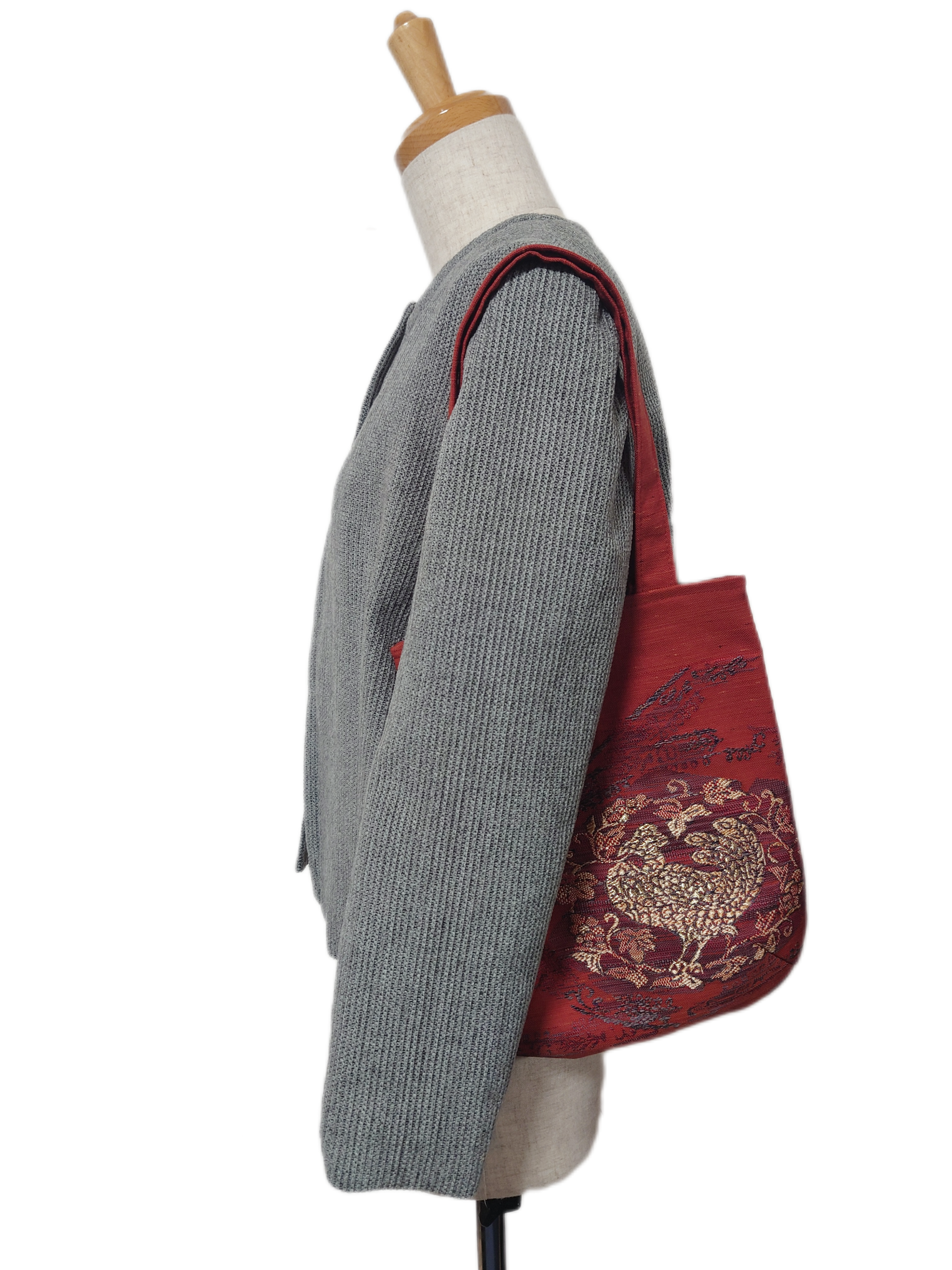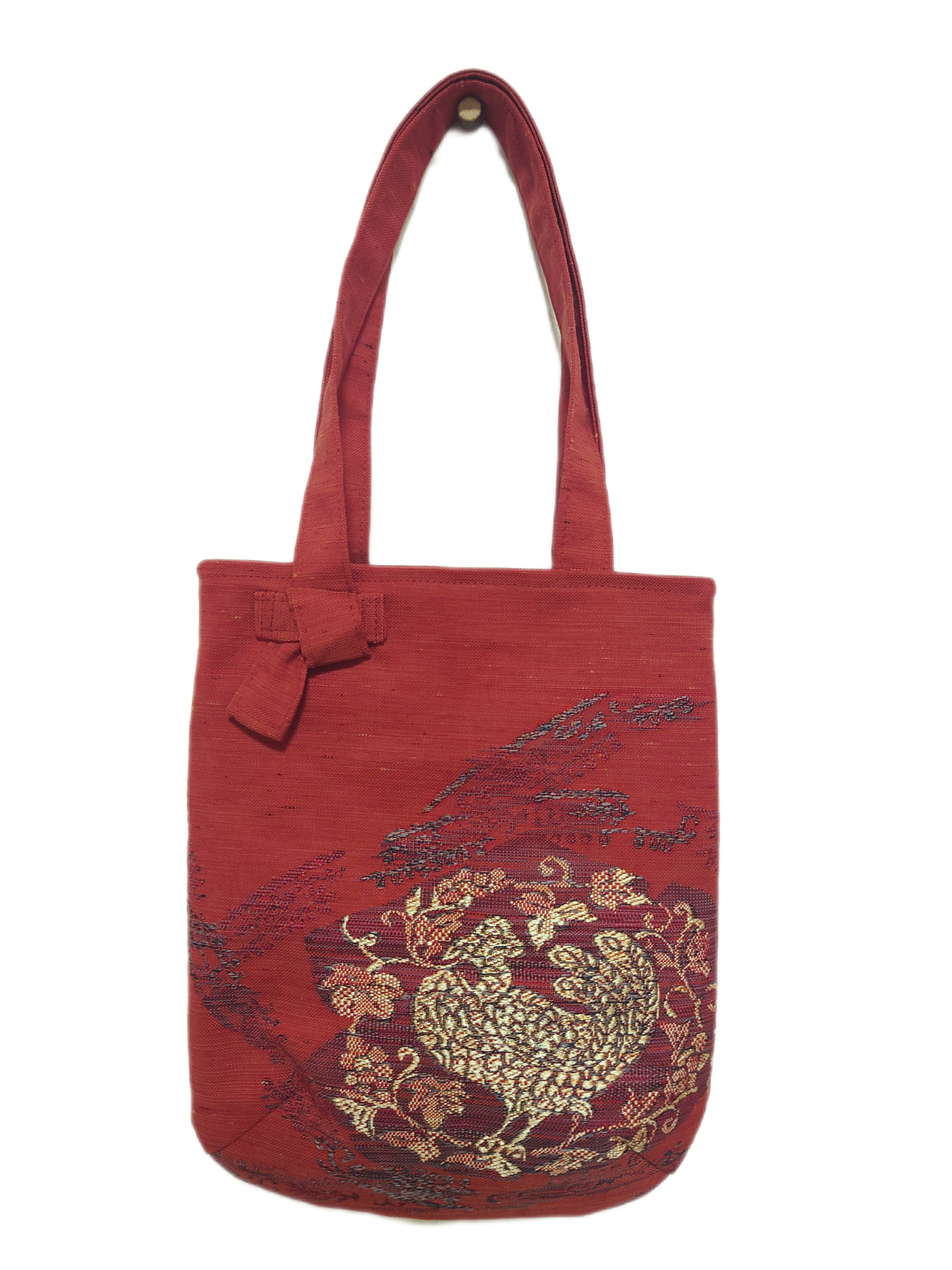 落ち着いた朱赤に鳳凰の柄が織り込まれた素敵だ帯のリメイクです。