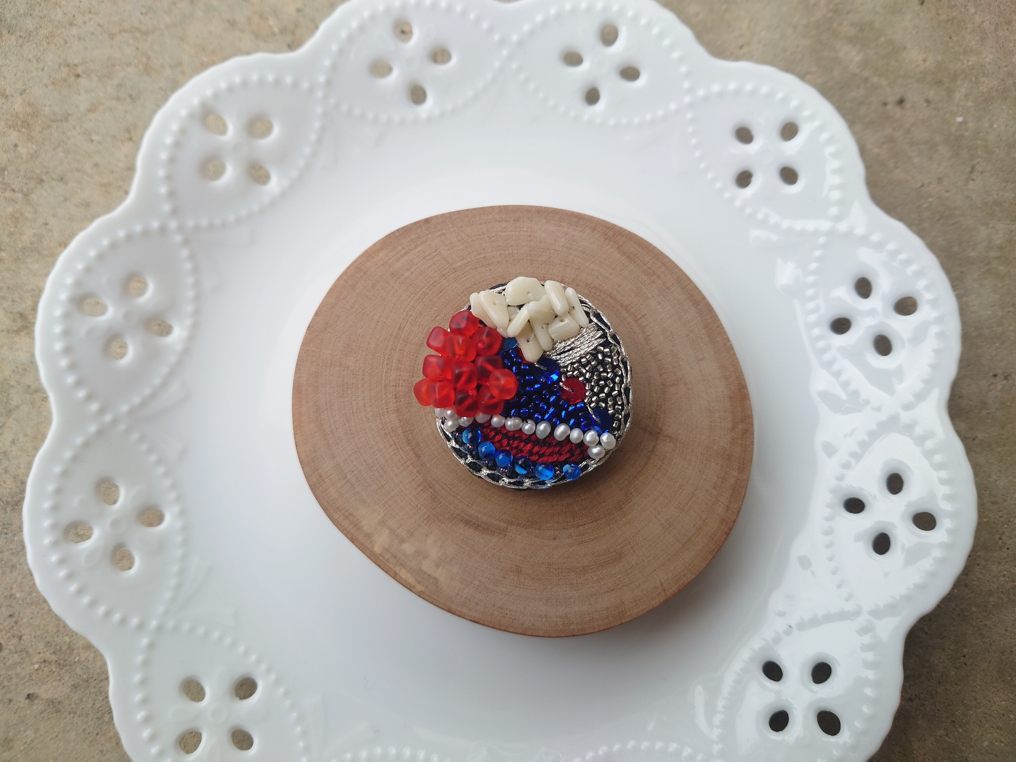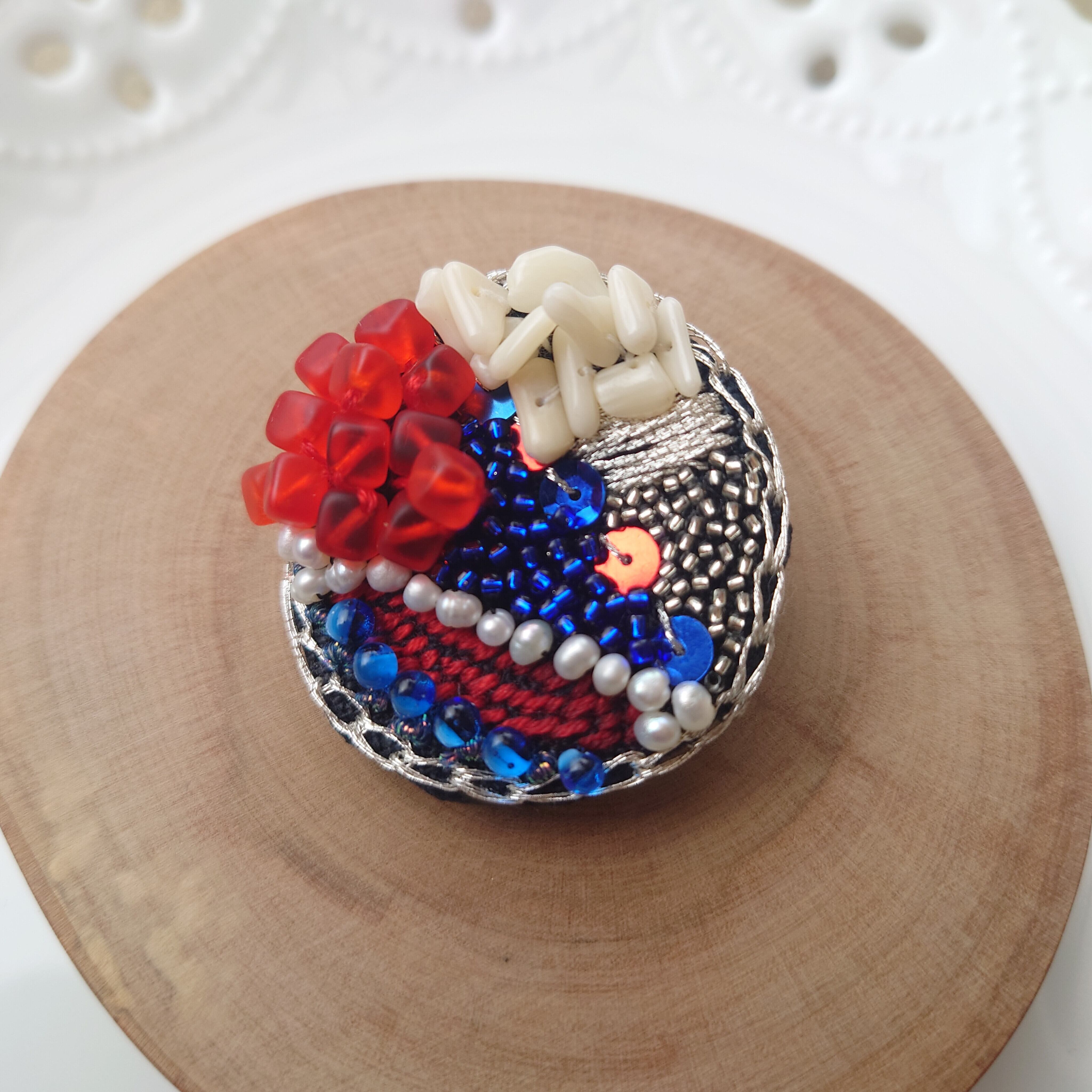 ガラスビーズと淡水パールスパンコール、白珊瑚等で丁寧に刺繍や縫い付けをしたブローチです。